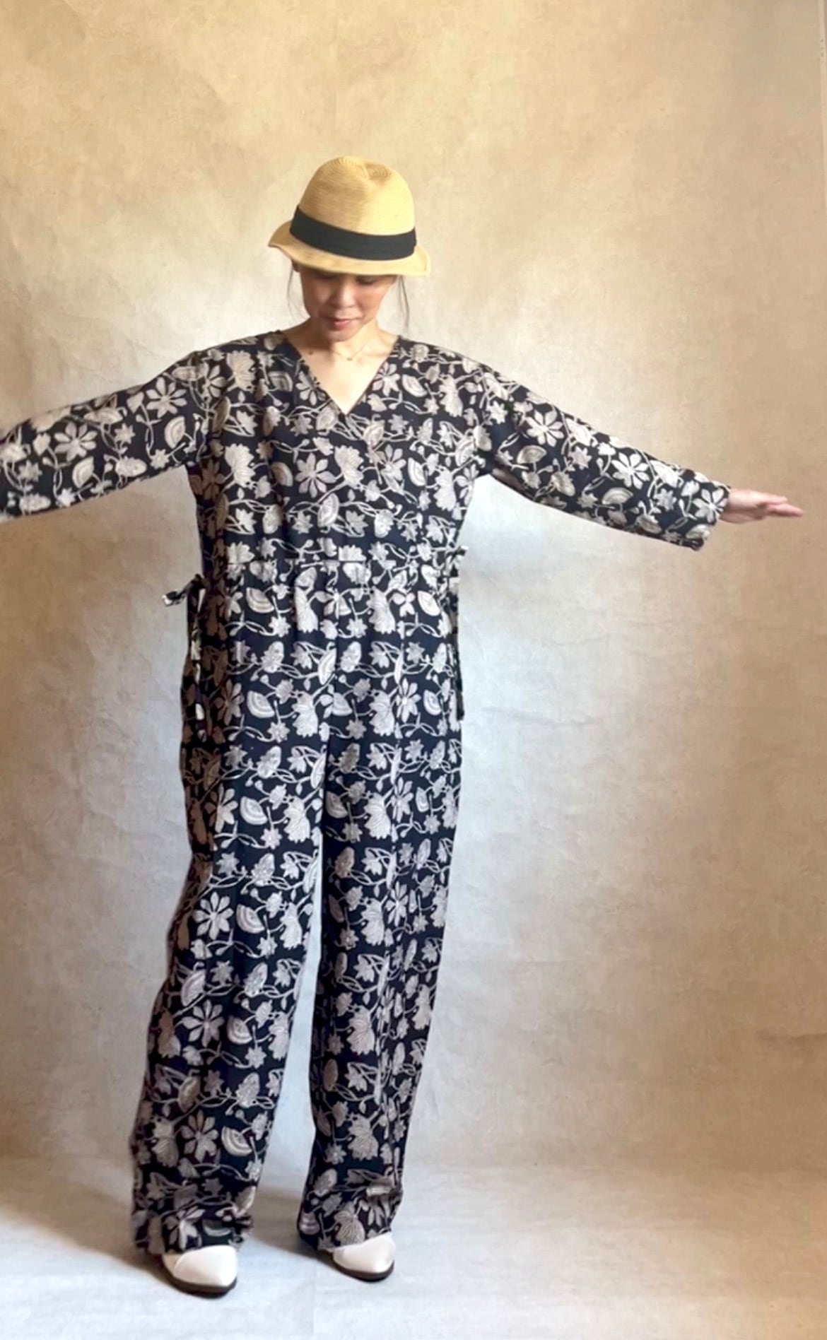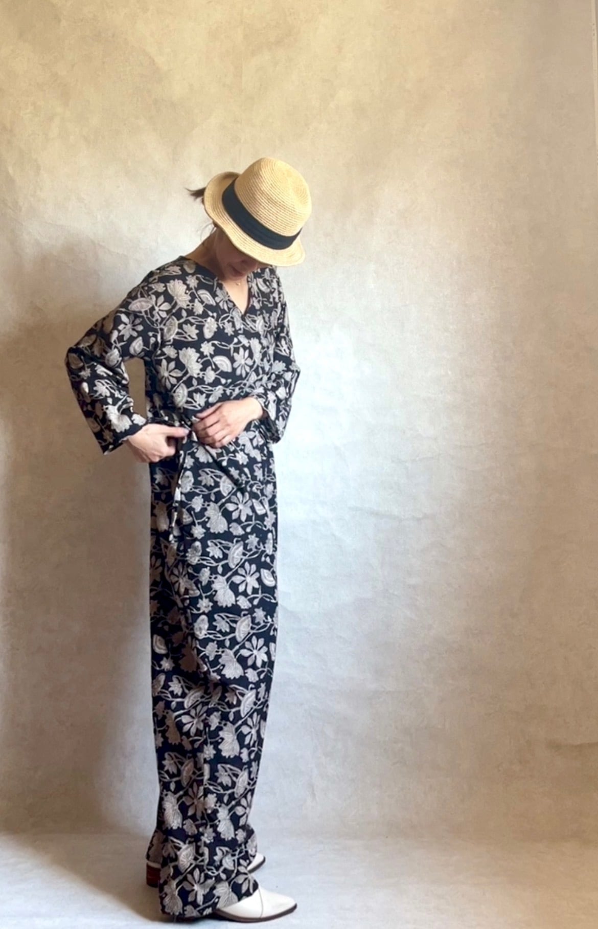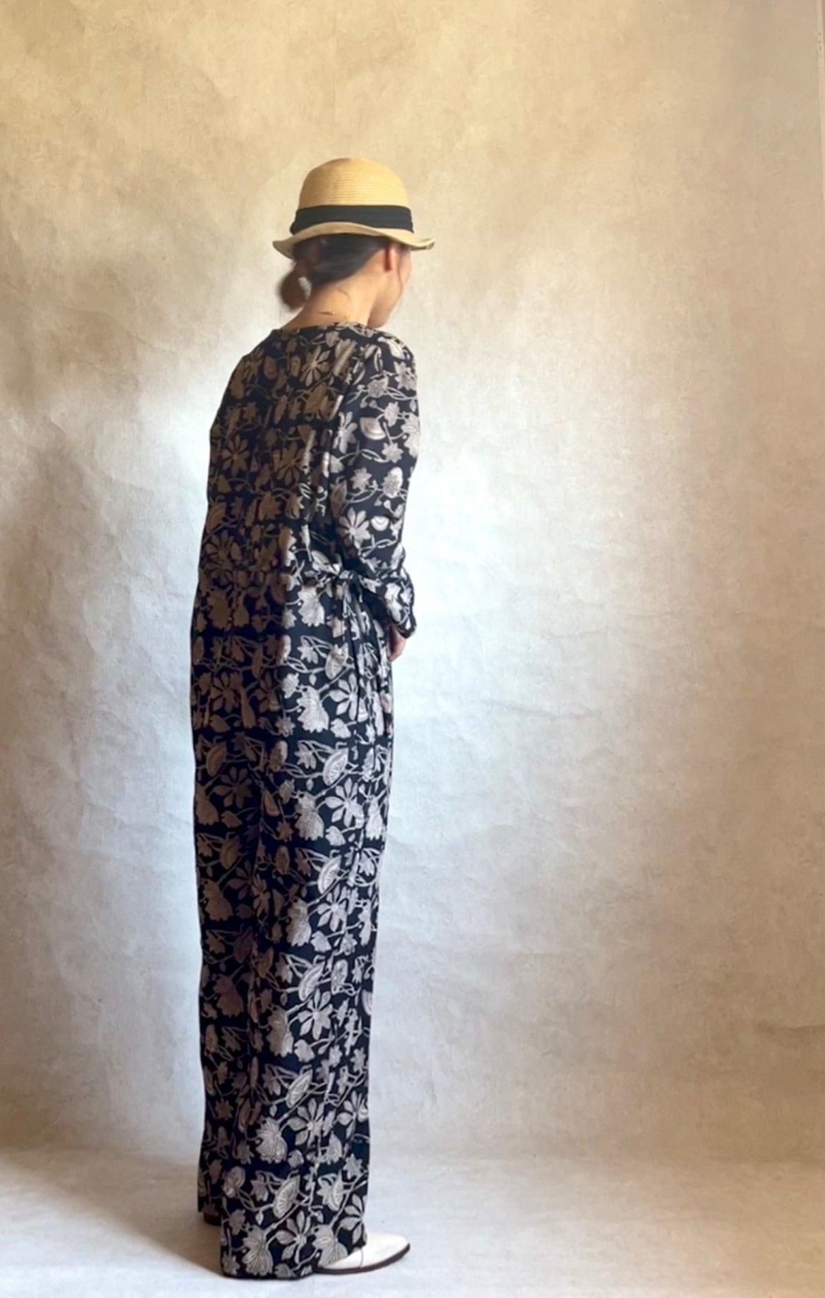 やさしいブロックプリントの花柄が、華やかすぎず自然に肌になじみます。