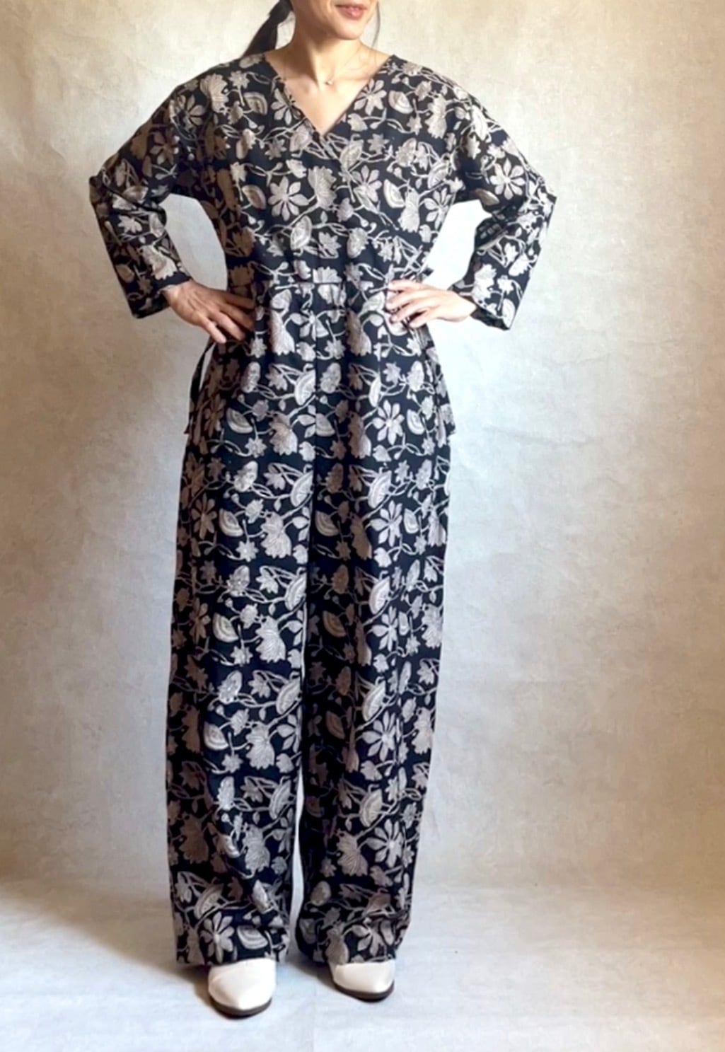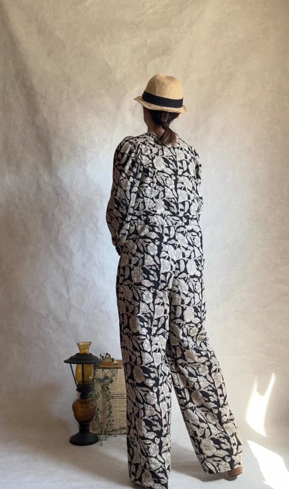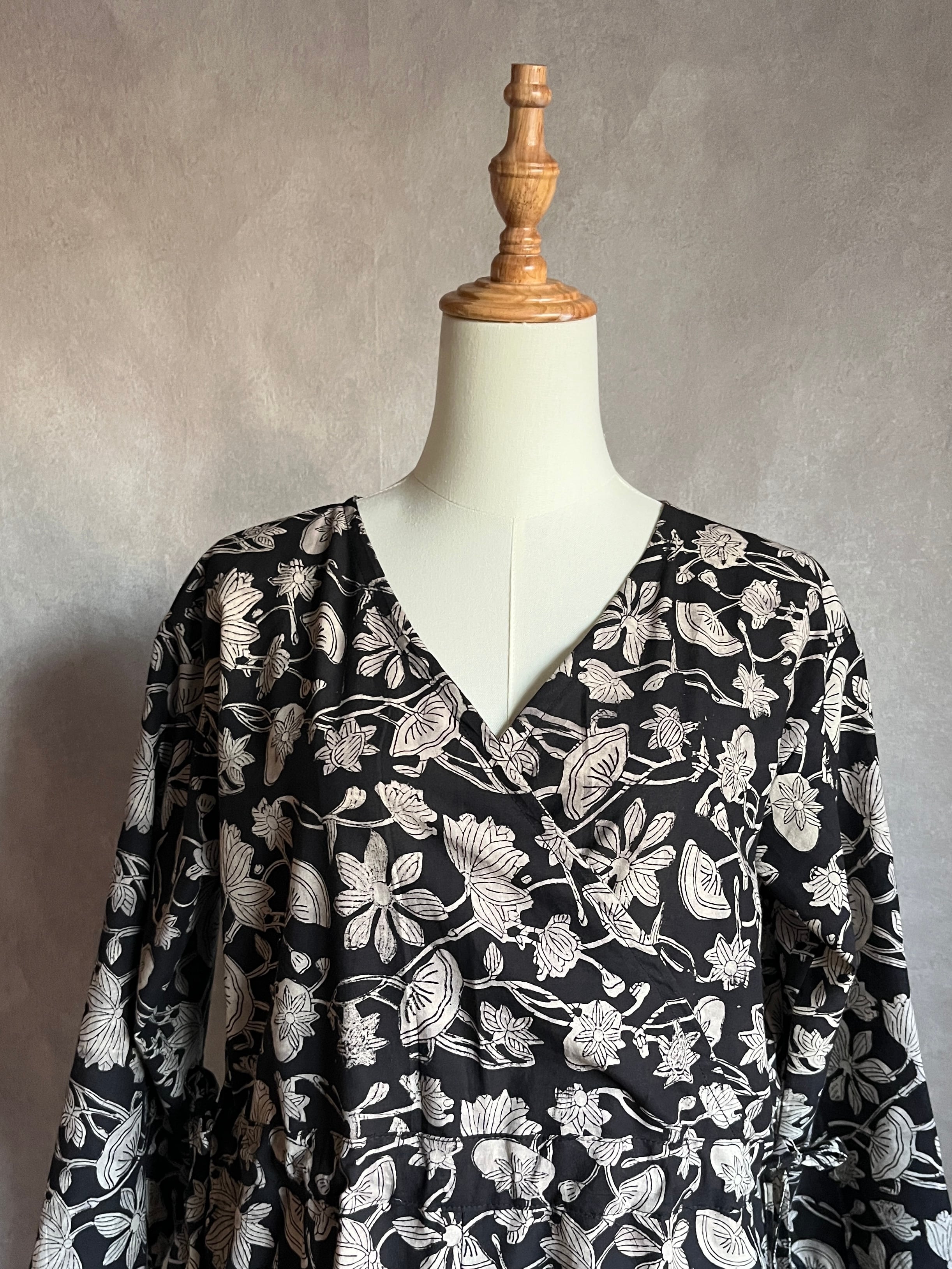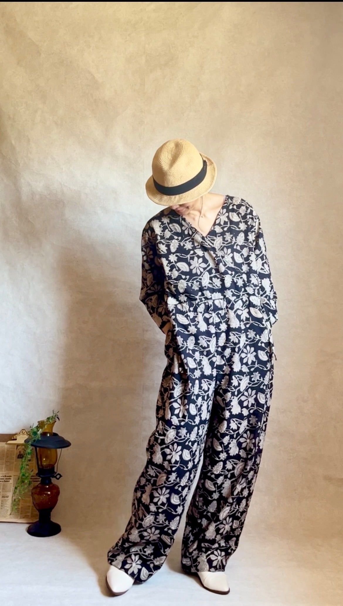 やさしいブロックプリントの花柄が、華やかすぎず自然に肌になじみます。