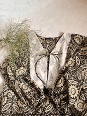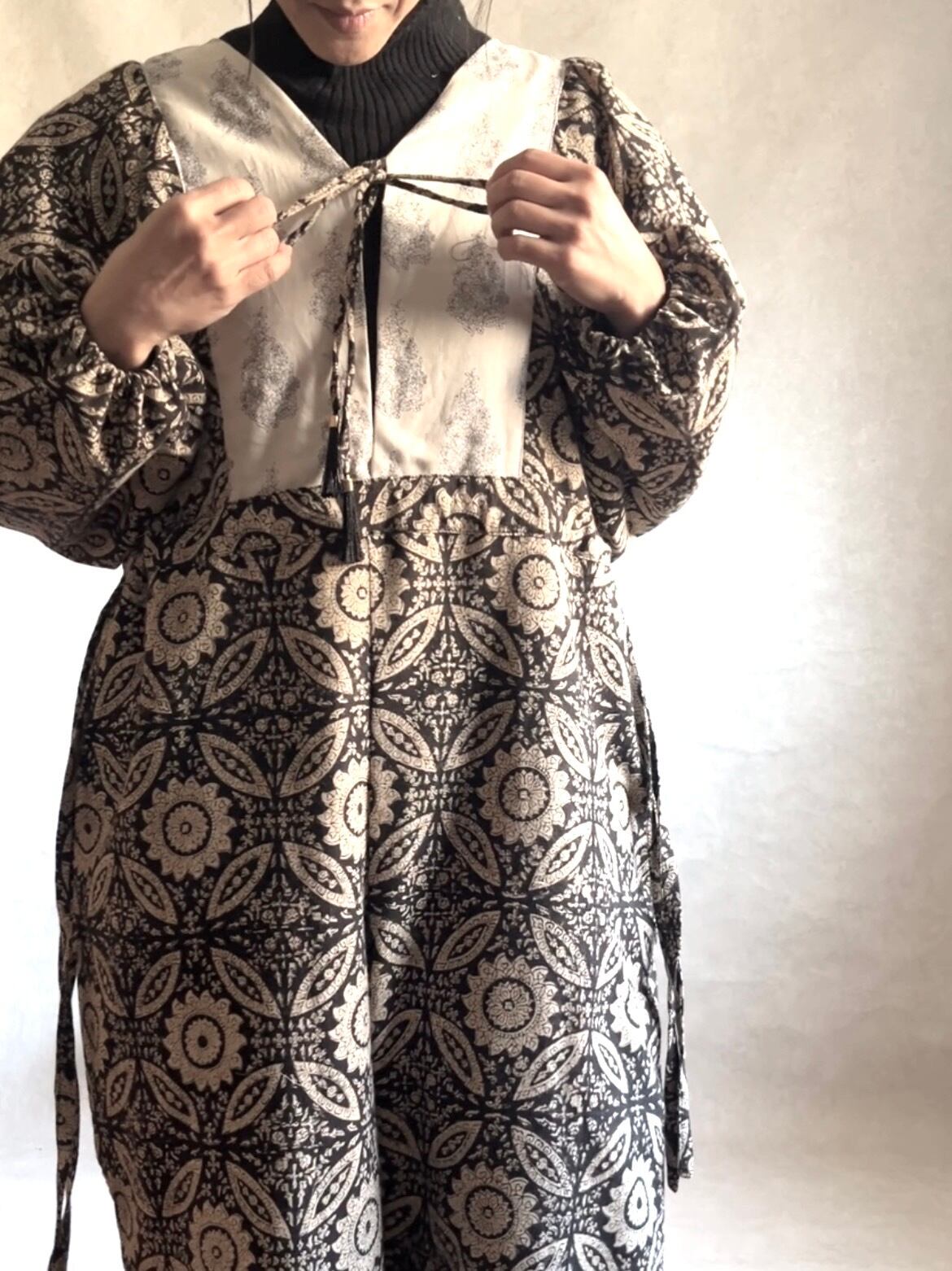やさしいブロックプリントの花柄が、華やかすぎず自然に肌になじみます。